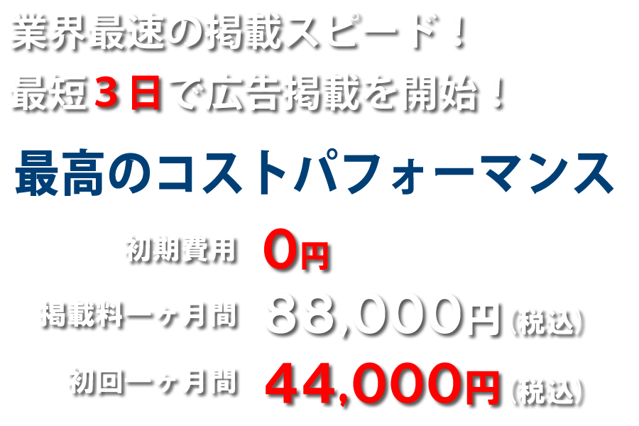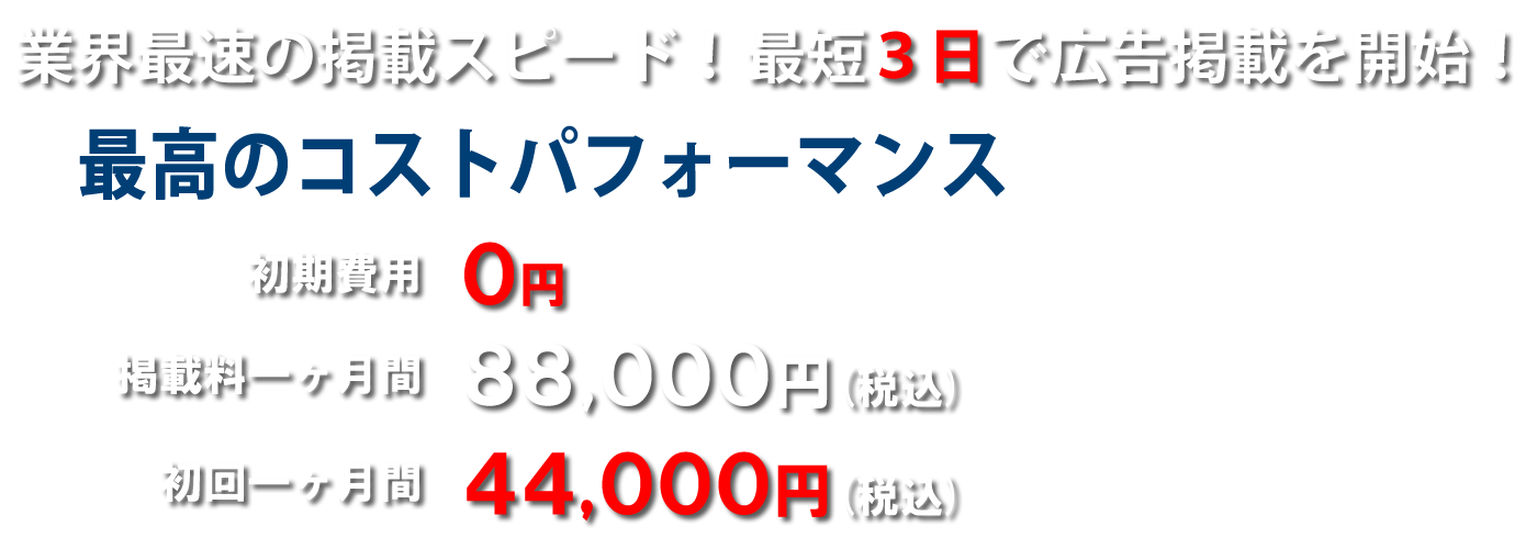 掲載料金は一月単位で、かかる費用は月額掲載料金88,000円(税込)のみです。更に初月のみ44,000円(税込)での掲載可能です。