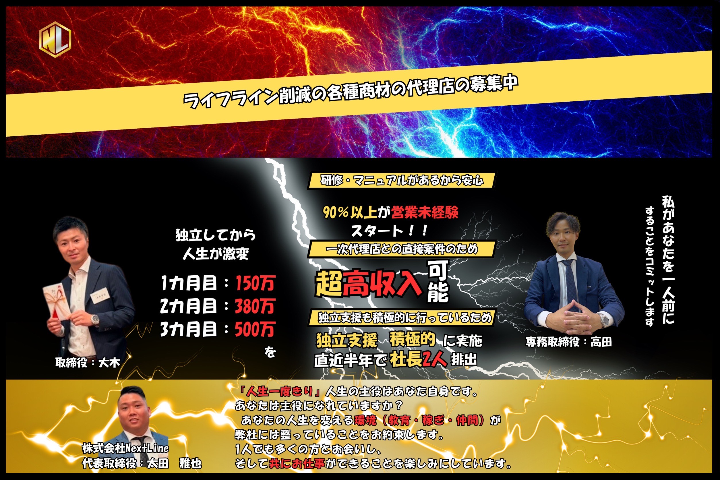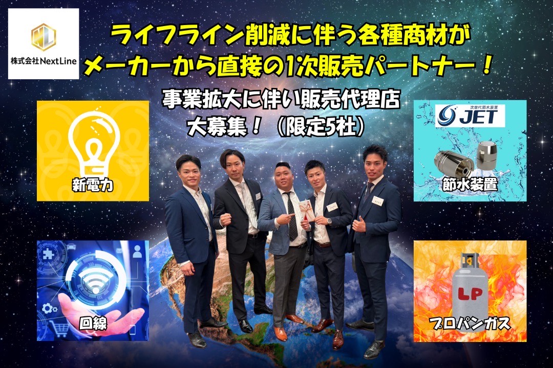 「NextLine」では、リース、人材紹介、住宅設備機器、ガスや電気、光回線などのライフライン商材の販売など多岐にわたる事業を展開しております。今回募集するコスト削減商材は、1次商流での販売となる為、高額インセンティブの支給が可能です。